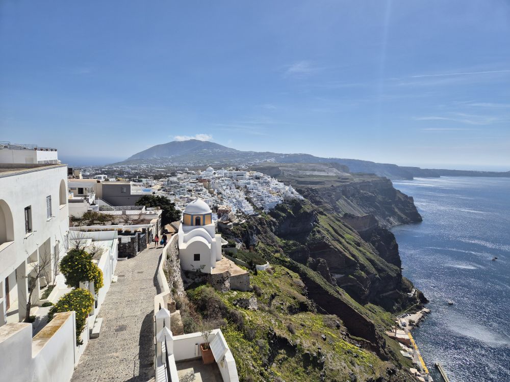 피라마을도 다녀왔어요. 3월초 산토리니는 성수기가 아니라 관광객이 많이 없고 문을 연 식당이나 상점들이 많이 없었어요. 그래서 저희 부부는 더 좋았던 것 같아요. 가보고 싶었던 산토리니를 고즈넉하게 즐길 수 있었거든요. 식당들이 문을 많이 열진 않았지만 아예 열지 않은 건 아니라 맛있는 음식도 많이 먹었고, 상점도 아예 문을 열지 않은 건 아니라 저희가 원하는 기념품들도 구매할 수 있었어요. 천천히 피라마을도 즐기고 왔답니다. 피라 세 개의 종도 천천히 보고 사진찍고 왔구요. 당나귀 조형물도 봤어요. 가파른 언덕과 계단이 많은 산토리니 특성상 당나귀가 짐과 사람을 날랐다고 해요. 피라에는 동키택시가 있다고해요. 실제로 이아마을에서 오픈준비중인 숙소에서 당나귀를 이용해 짐을 나르는 걸 볼 수 있었어요.