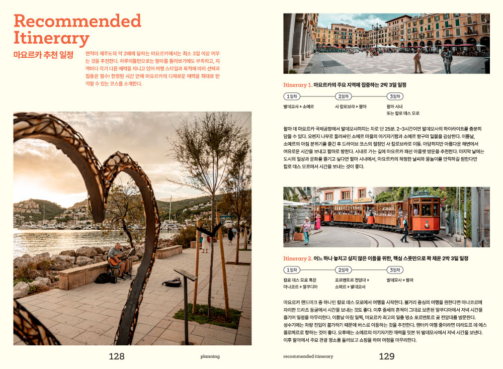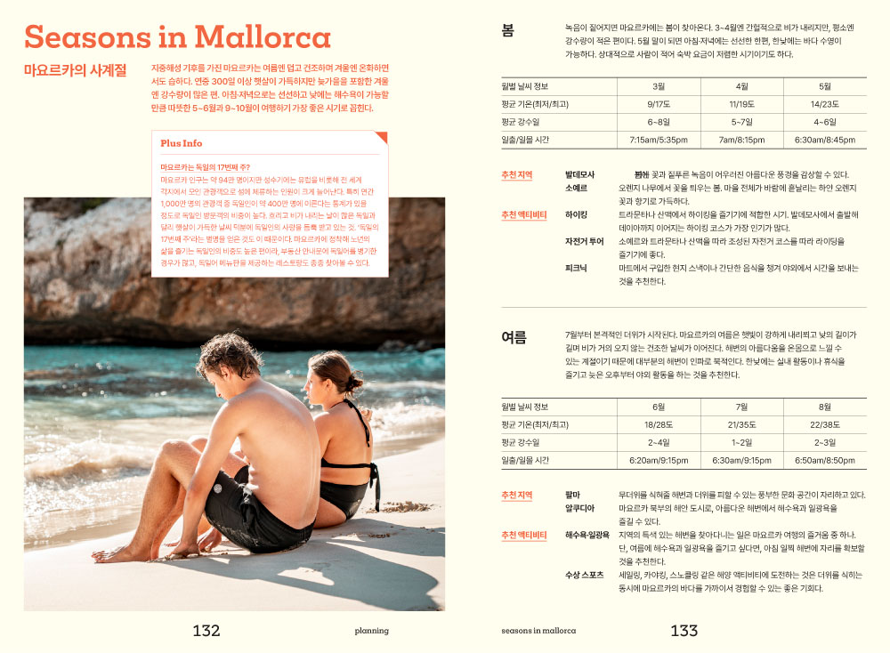 낯설지만 매력적인 마요르카와 첫인사를 나누는 시간. 마요르카 여행에서 빼놓을 수 없는 핵심 포인트인 최고의 해변, 다채로운 액티비티, 쇼핑정보, 미식 정보가 담겨져 있습니다. 여행 스타일에 맞는 추천 여행법을 통해 나만의 마요르카 여행을 꿈꿔봅니다.